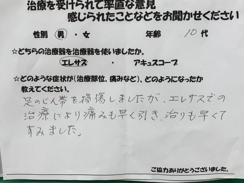 足のじん帯を損傷しましたが、エレサスでの治療により痛みも早く引き、治りも早くてすみました。